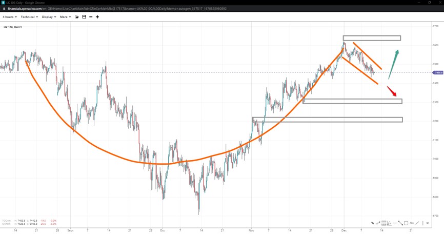 Germany’s 40 index pattern resembles a head-and-shoulder pattern, with the right shoulder incomplete as the neckline at 14120 hasn’t been tested yet. 14450 is the shoulder peak, and if it is reached first, the index might decelerate towards 13500. Otherwise, it might rise to 14600 and above for a new peak.