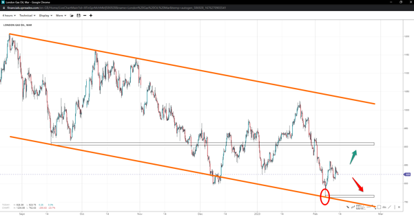 London gas received rejection at the bottom of its descending channel near 783 and bounced higher. If the bullish trend continues towards the 900 handle, we might see the upper trendline revisited. But losing the 800 handle will not only open the door to the previous lows but increase the chances of further declines to 750 and below.