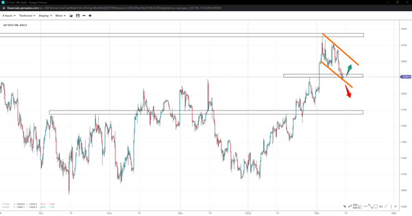 UK’s FTSE formed a wedge pattern by the record high of 7950 and pulled back to 7850 in what appears to be a correction. Falling deeper will expose 7770, with the short-term trend prevailing to 7620 if bulls fail to garner enough demand. On the other hand, we could see a bounce towards the 8k handle, implying a larger wedge pattern might be in the making.