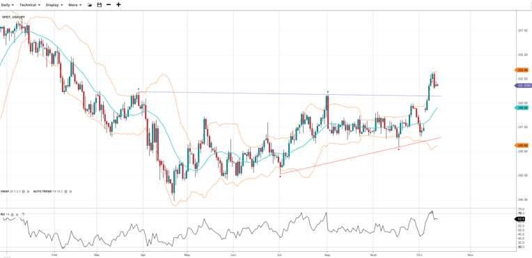 USD/JPY despite a pullback on Friday, the pair continues its bullish impulsive move, trading at 151.84 above the VWAP of 149.56. The RSI at 64 signals strengthening momentum. Support lies at 145.66, while resistance is at 153.46.