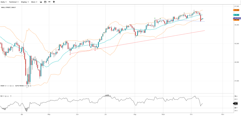 Wall Street remains in a bullish trend but undergoing a correction after Friday’s sharp drop, trading at 45,915, slightly below its VWAP of 46,366. The RSI at 45 reflects a cooling market. Support is at 45,718 and resistance is at 47,015.