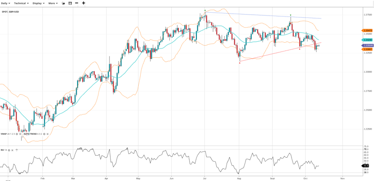 GBP/USD is testing the lower bounds of its longer term price range, trading at 1.3350 slightly below the VWAP of 1.3424. The RSI at 42 indicates lack of bullish strength. Support is at 1.3301 and resistance at 1.3545.