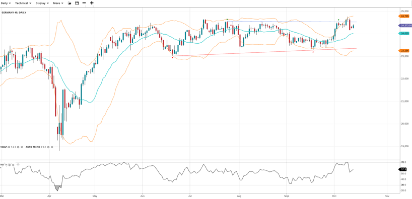 Germany 40 is back in a neutral trend after a false break to new highs, trading at 24,374 near its VWAP of 24,025. The RSI at 57.9 suggests modest bullish sentiment. Support is at 23,256, with resistance at 24,795.