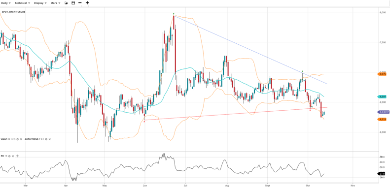 Brent Crude continues in a bearish trend but holding in a range phase, currently at 6,341 and below its VWAP of 6,597. RSI at 37.8 indicates weak buying pressure. Support is at 6,219 and resistance at 6,975.