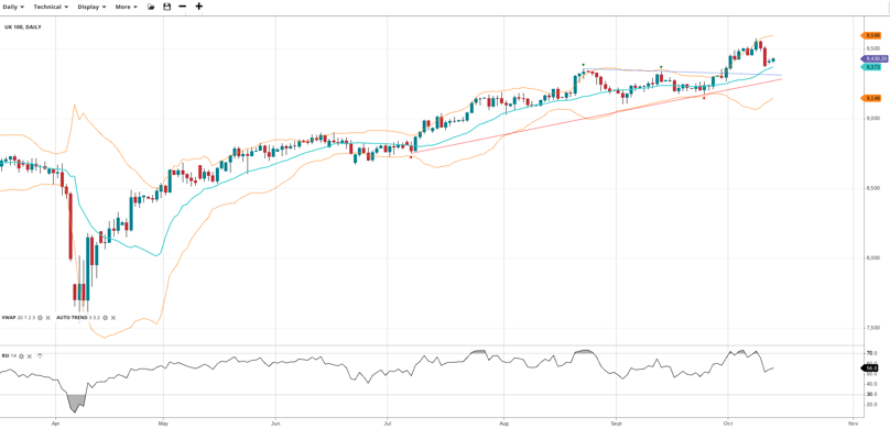 The UK 100 is in a bullish trend but currently in a pullback phase, trading at 9,430, just above the VWAP of 9,373. The RSI at 56 signals stable but slowing momentum. Support is at 9,148, while resistance stands at 9,598.