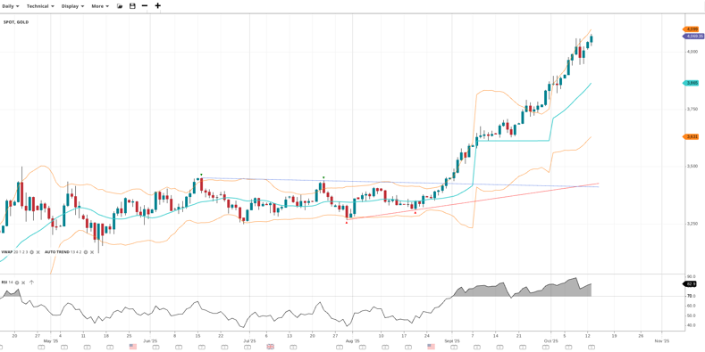 Gold maintains its explosive bullish impulsive trend into a fresh record high on Monday, trading at 4,069 above its VWAP of 3,865. The RSI at 83 shows extreme overbought conditions. Support lies at 3,631, with resistance at 4,099.