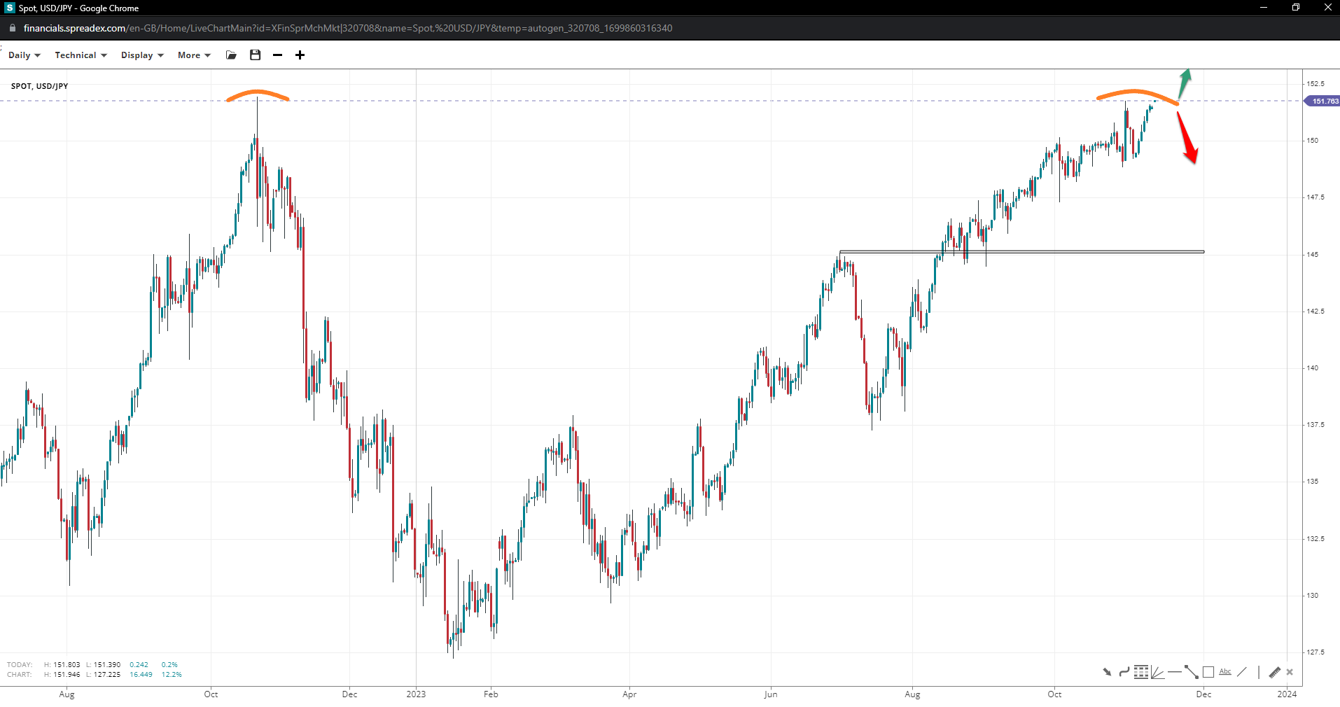 The Japanese yen weakened as much to reach multiyear lows against the dollar but reached shy of USDJPY 152 to form a triple top. A rejection here would imply at least pullbacks towards 148.79 and 147.30, with the chances of 145s increasing the lower we get. Breaking higher would bring 153 closer, as it would suggest price discovery.