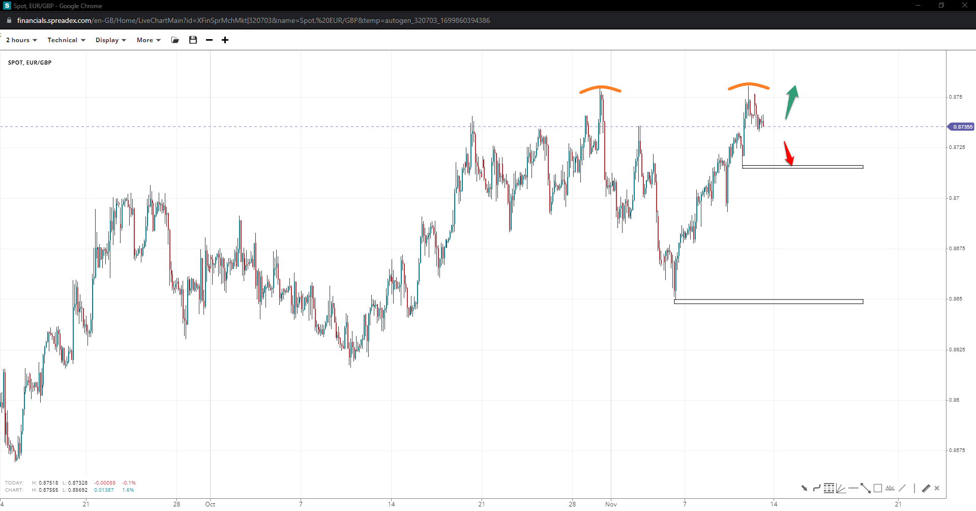 A double-top formation may have competed at 0.875 in EURGBP, becoming a short-term cap-and-handle pattern pending a drop towards 0.87 or a deeper downturn to 0.865. if the peak gives way to potential bullish pressure, the following logical level bulls will face lies at 0.88.