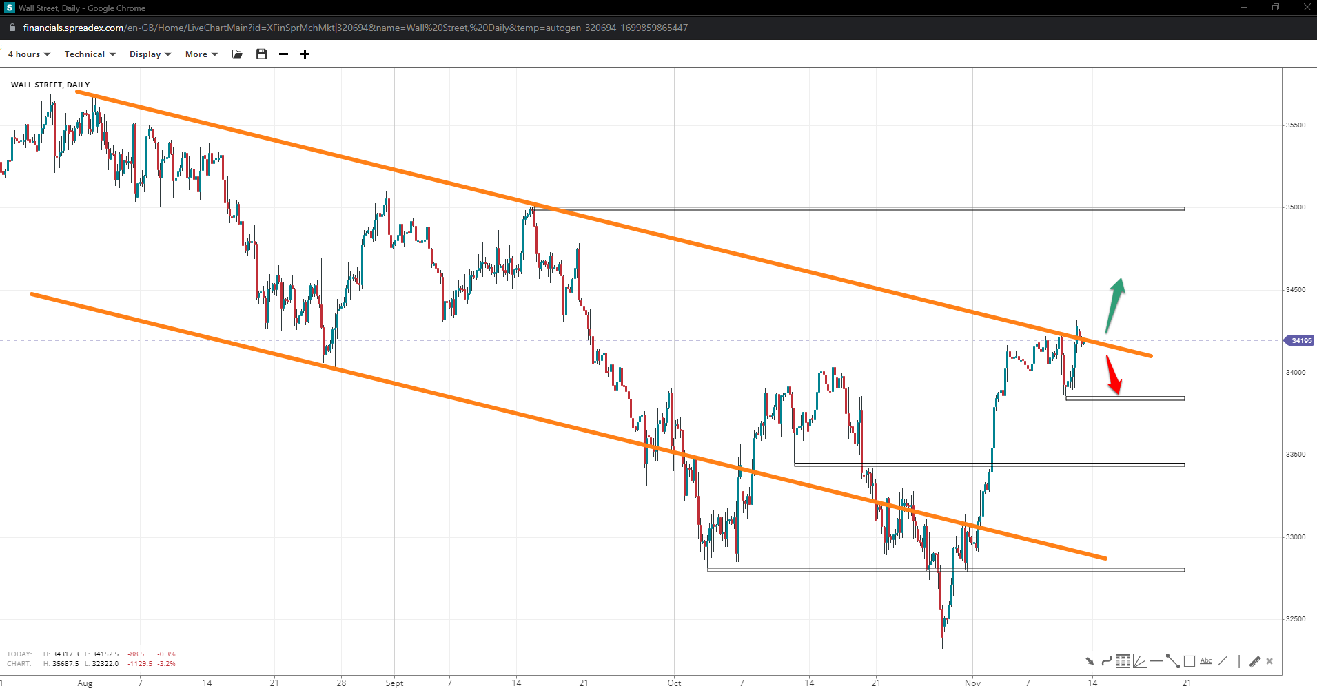The upside leg past 34K has weighed on Wall Street prices, with the upper descending channel trendline increasing speculation for pullbacks towards 32810 in light of a potential inverse head-and-shoulders. Losing 33850 will slightly raise the chances of a drop towards 33450, but if the support holds firm, the next level up is at 35K.