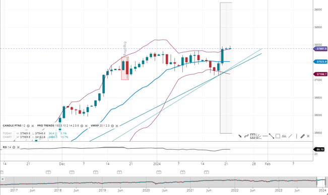 Wall Street shows a bullish trend with the price pushing 2 standard deviations above the 20-period VWAP of 37,523, seemingly breaking out from the recent consolidation. Support is found at 37,168, while resistance sits at 37,896. The RSI is elevated at 65, pointing to a strong bullish momentum.