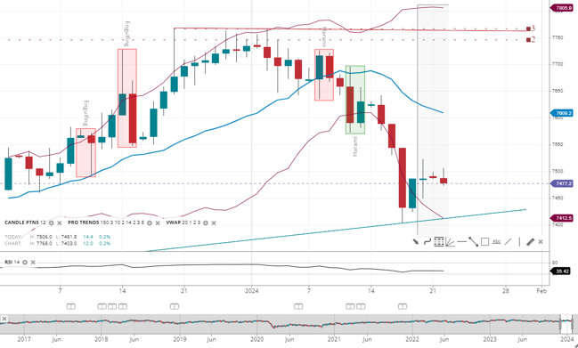 UK 100 has entered a bearish trend, as indicated by the price slumping down 2 standard deviations from the VWAP of 7,609.2. The support level has dropped to 7,412.5, and resistance is at 7,805.9. The RSI has fallen to 35, indicating potential for further declines.