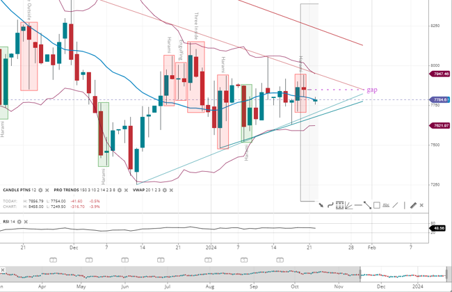 Brent Crude Oil remains neutral, with prices drifting back and forth around the 20-period VWAP of 77.84. The commodity has formed support at 76.21 and faces resistance at 79.47. The RSI is neutral at 48.