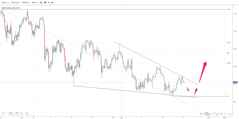 UKBRENTOIL continues to descend in a diagonal pattern after bears added to their shorts near the 98,00 trendline resistance.  The market could revisit the previous low at 91.50 where we expect a double bottom after a false break towards 90.00 to incur. A close above the trendline resistance could signal a reversal with the first target above triple digits.
