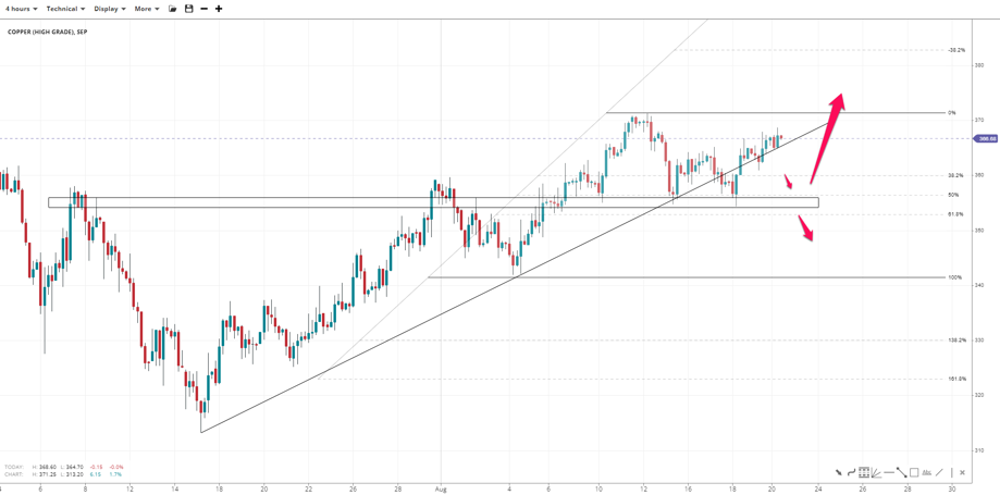 Copper rejoined the bullish trend after forming strong support at the 50% Fibonacci near 355,00. The price is now heading towards the local top of 370,00, the break of which could lead to further upside toward the 380,00 mark. If bearish commitment improves, the next support is near 350,00, where the golden ratio of the last upward leg lies. Sliding lower would negate the bullish view and expose 340,00.