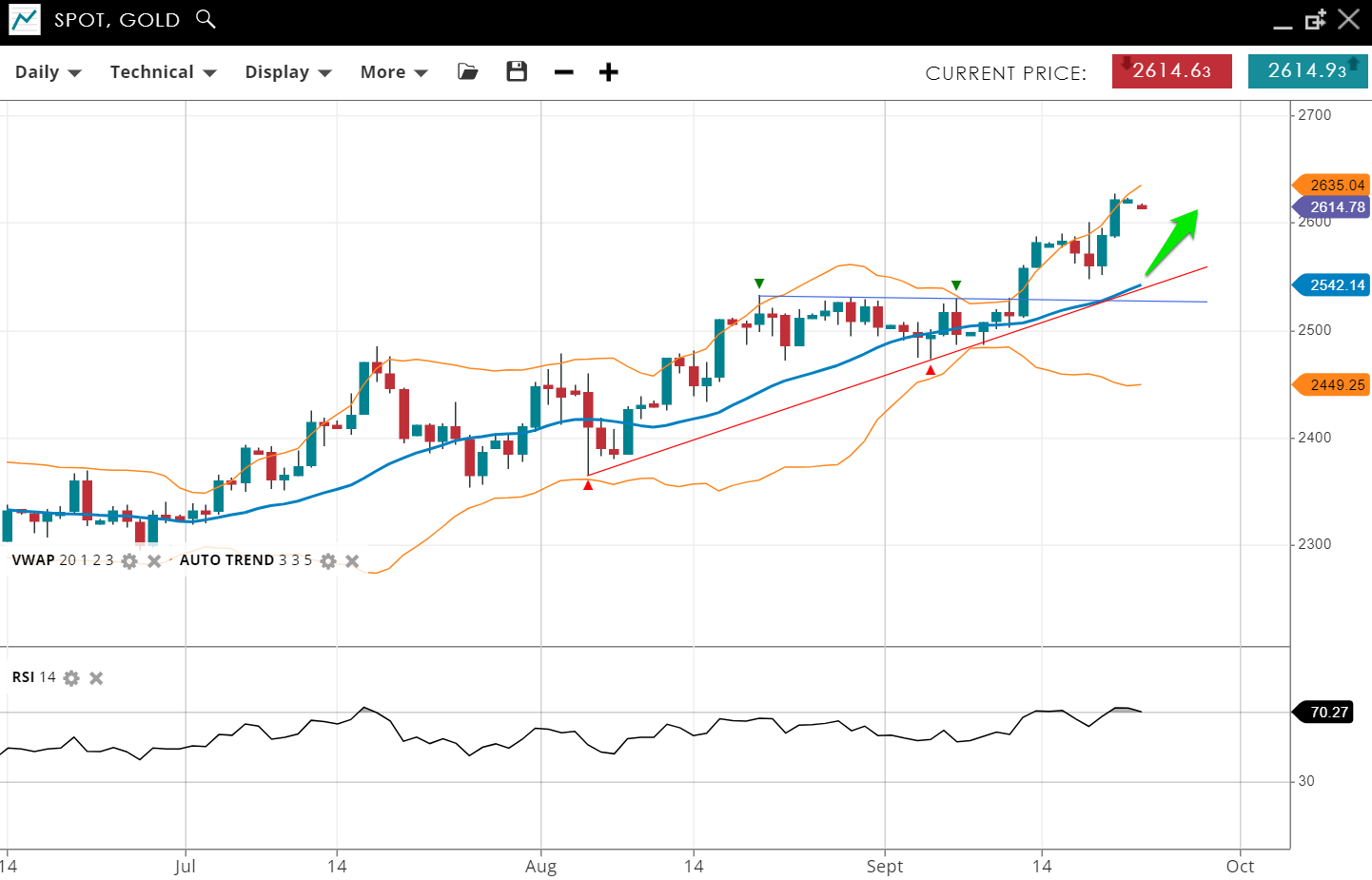 Gold continues its bullish run, currently in an impulsive phase at a record high. The price is 2,614, above the VWAP (20) of 2,542. Support is at 2,449, and resistance is at 2,635. The RSI of 70 reflects strong bullish momentum, and overbought conditions.