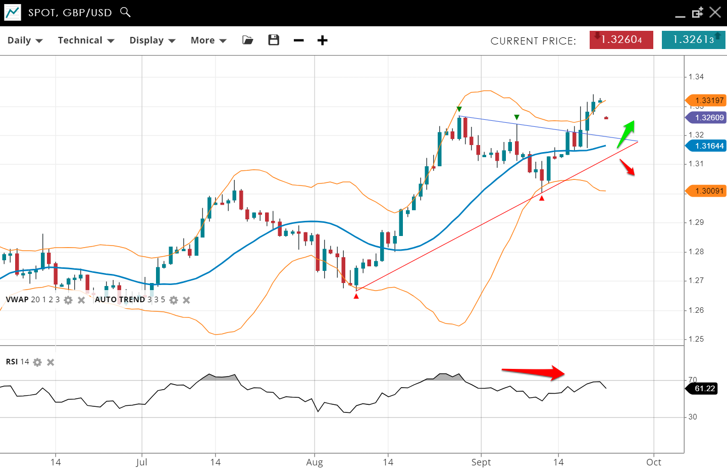 GBP/USD continues its bullish trend, staying in an impulsive phase into new 2024 highs. The price is 1.3319, sitting comfortably above the VWAP (20) of 1.3164. Support is at 1.3009, while resistance is at 1.3319, the current price level. The RSI of 61 signals solid bullish momentum but bearish divergence has appeared.