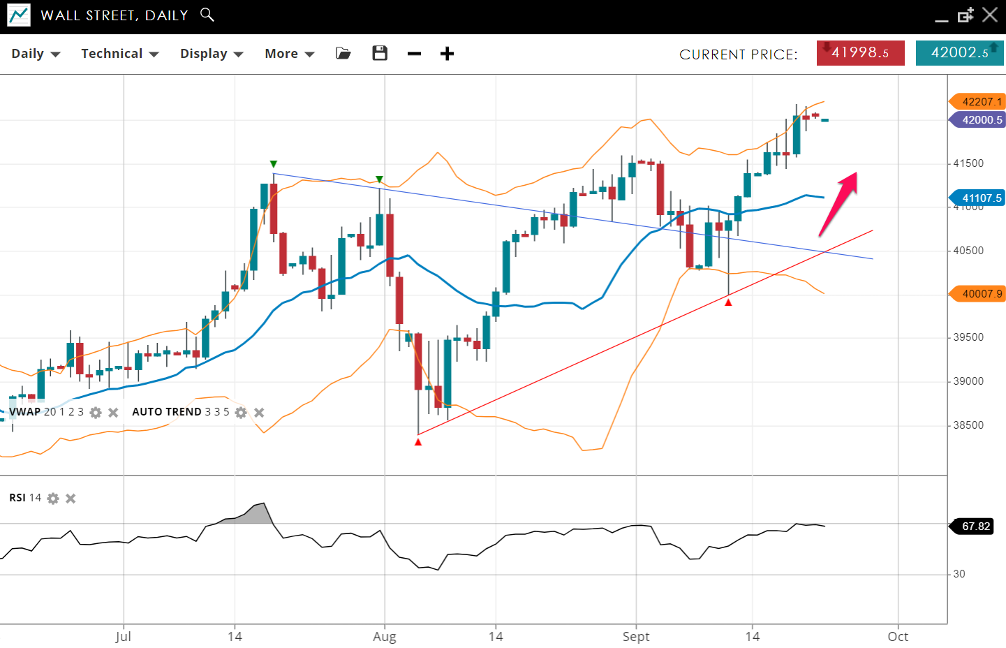 Wall Street continues its bullish trend, still in an impulsive phase. The price is at 42,000, well above the VWAP (20) of 41,107. Support is at 40,007, with resistance at 42,207. An RSI of 67 indicates robust bullish momentum but without the conviction of an overbought reading.