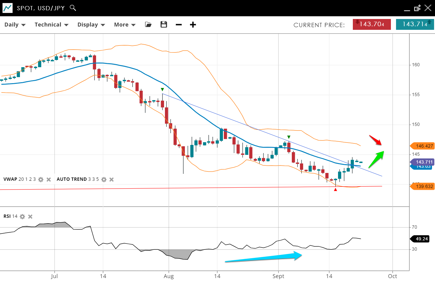USD/JPY remains in a bearish trend, now in a corrective phase with a move over a down trendline. The price is 143.71, slightly above the VWAP (20) of 143.03. Support is set at 139.63, with resistance at 146.42. An RSI of 49 is a big swing from bearish to neutral momentum, implying a new trend or perhaps a longer period of consolidation.