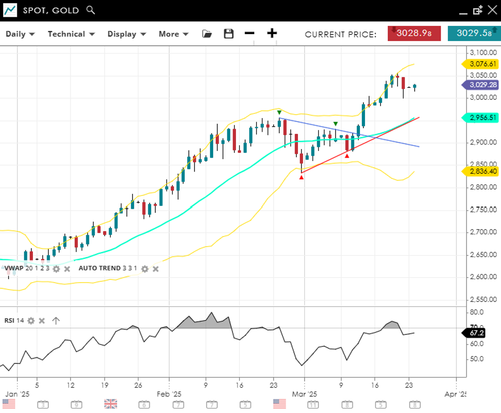 Gold remains firmly bullish and impulsive, hovering at 3,030 just off record highs and well above the 20‐day VWAP of 2,956. An RSI reading of 67 points to strong positive momentum. Should a pullback occur, 2,836 could offer support; otherwise, clearing 3,076 might extend the rally.