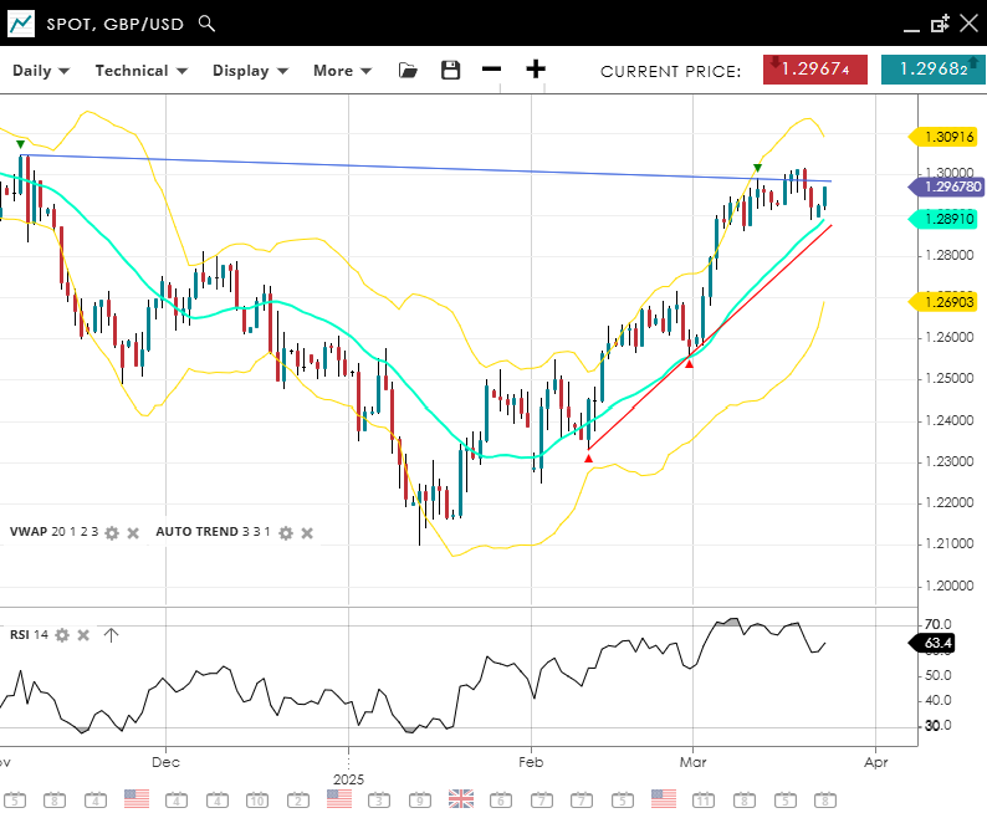 GBP/USD sustains its bullish tone in an impulsive move, trading around 1.2968—clearing the 20‐day VWAP of 1.2840. With the RSI at 63, upside momentum remains intact but off recent overbought levels. The pair’s support sits at 1.2690, and a break above 1.3091 could spark further advances.