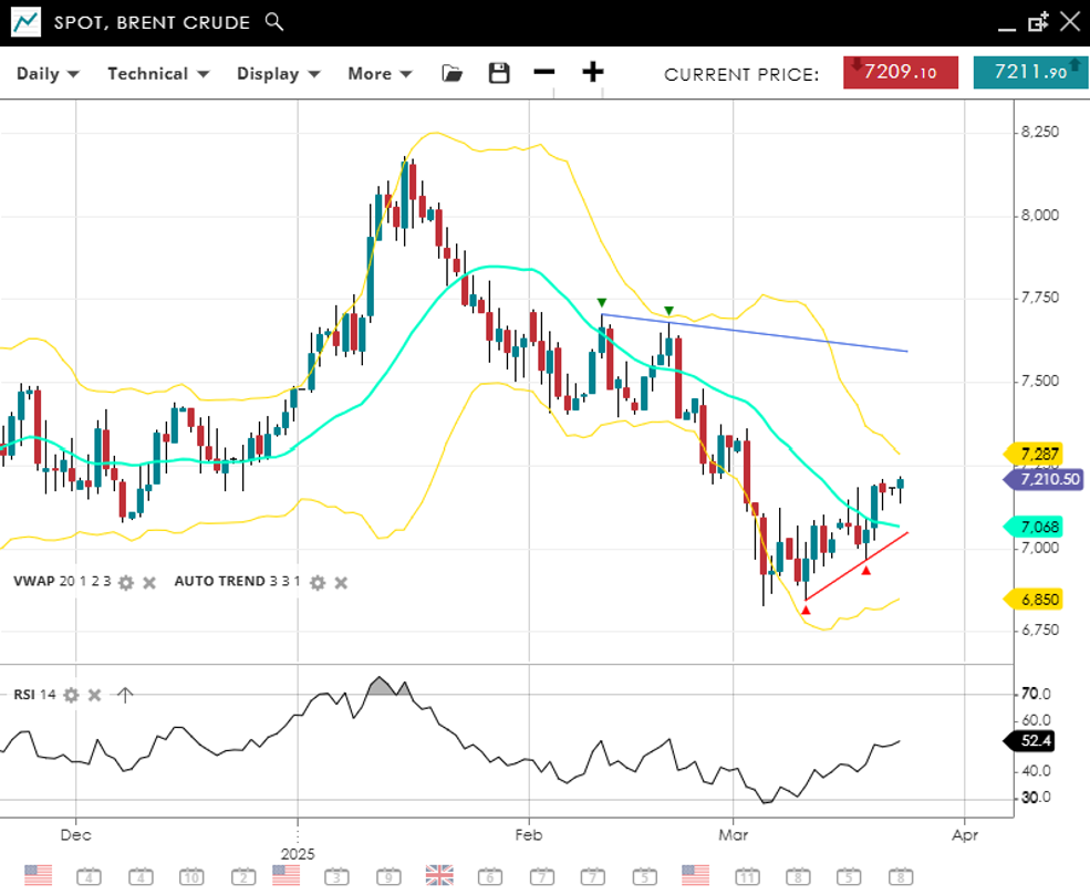 Brent Crude continues its bearish trajectory in a corrective phase at 7,210, above the 20‐day VWAP of 7,068 but overshadowed by a broader downtrend. The RSI at 52 signals mild momentum. Sellers are eyeing 6,850 support for another leg lower; any bounce could stall at 7,287.