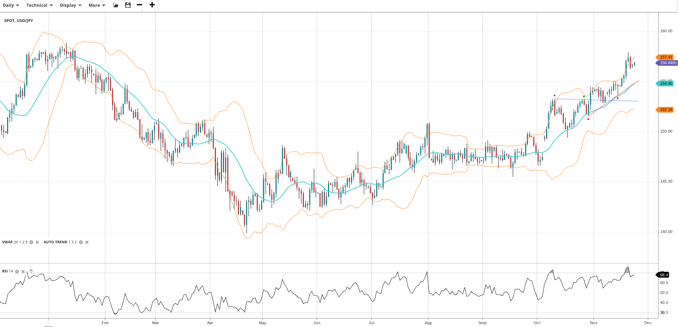 USD/JPY holds a bullish impulse structure, trading at 157.41 above the VWAP of 156.85, however there was a bearish engulfing candlestick at resistance from the January peak. RSI at 68.4 - down from very overbought levels signals slowing upwards momentum. Support is at 152.18, resistance at 157.41.