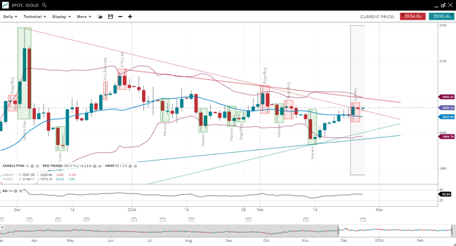 Gold is consolidating in a neutral trend, with its price just above the flat 20-period VWAP of 2,022 but close to it. The support level is at 1,994, with resistance at 2,050. The RSI at 55 indicates a neutral momentum, suggesting the market is assessing direction.