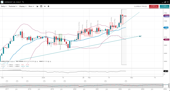 Germany 40 is currently in the impulsive phase of a bullish trend, with the price above its upward-sloping 20-period VWAP of 17,051. The index finds support at 16,678 and faces resistance near 17,340. The RSI stands at 68, indicating a positive momentum and approaching overbought territory.