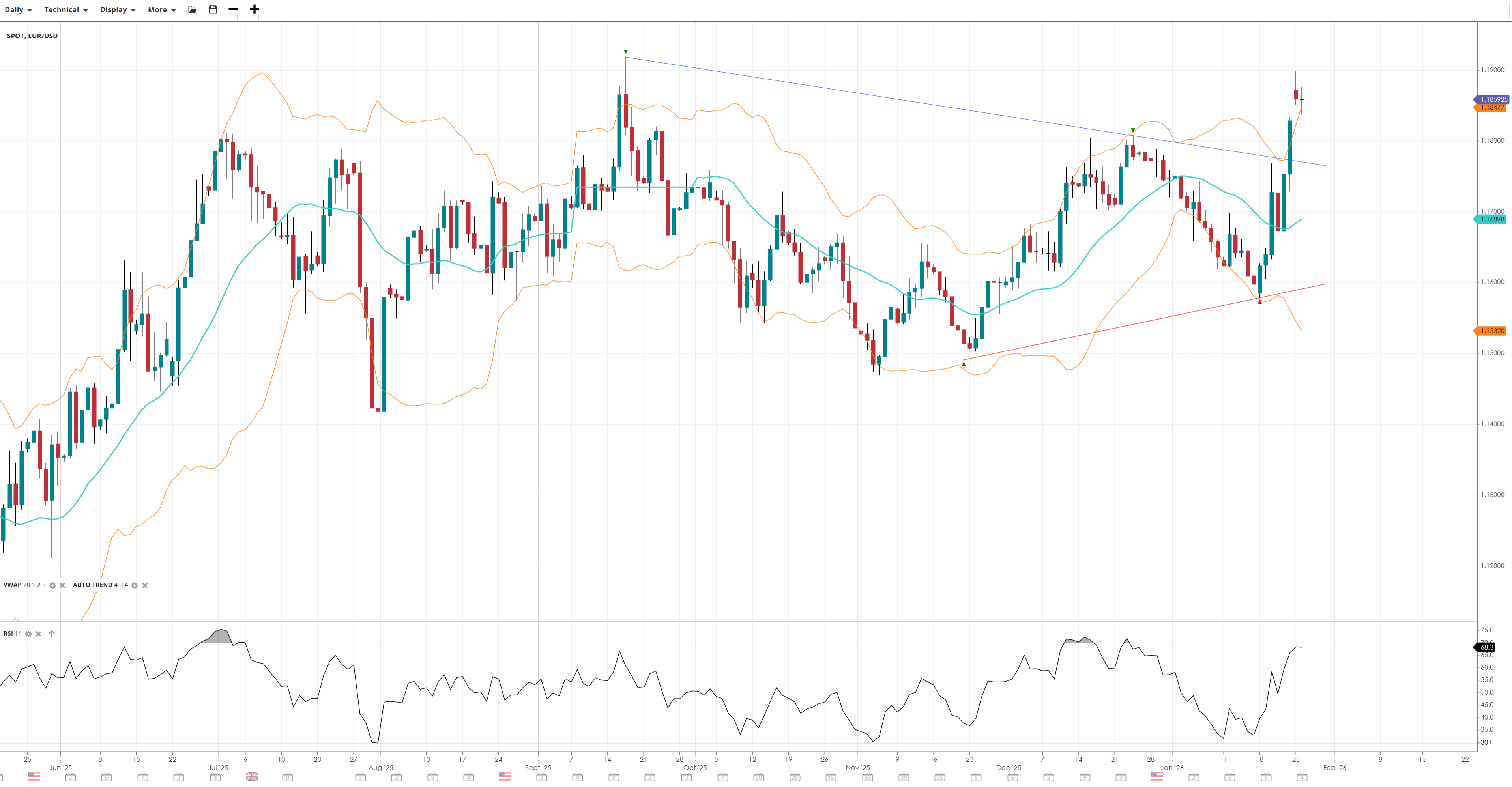 EUR/USD has broken above prior resistance at 1.18, trading comfortably above the VWAP but just below the 1.19 resistance. Renewed buying interest is visible, and momentum indicators point to growing strength. The pair is eyeing a further breakout to multi-year highs.