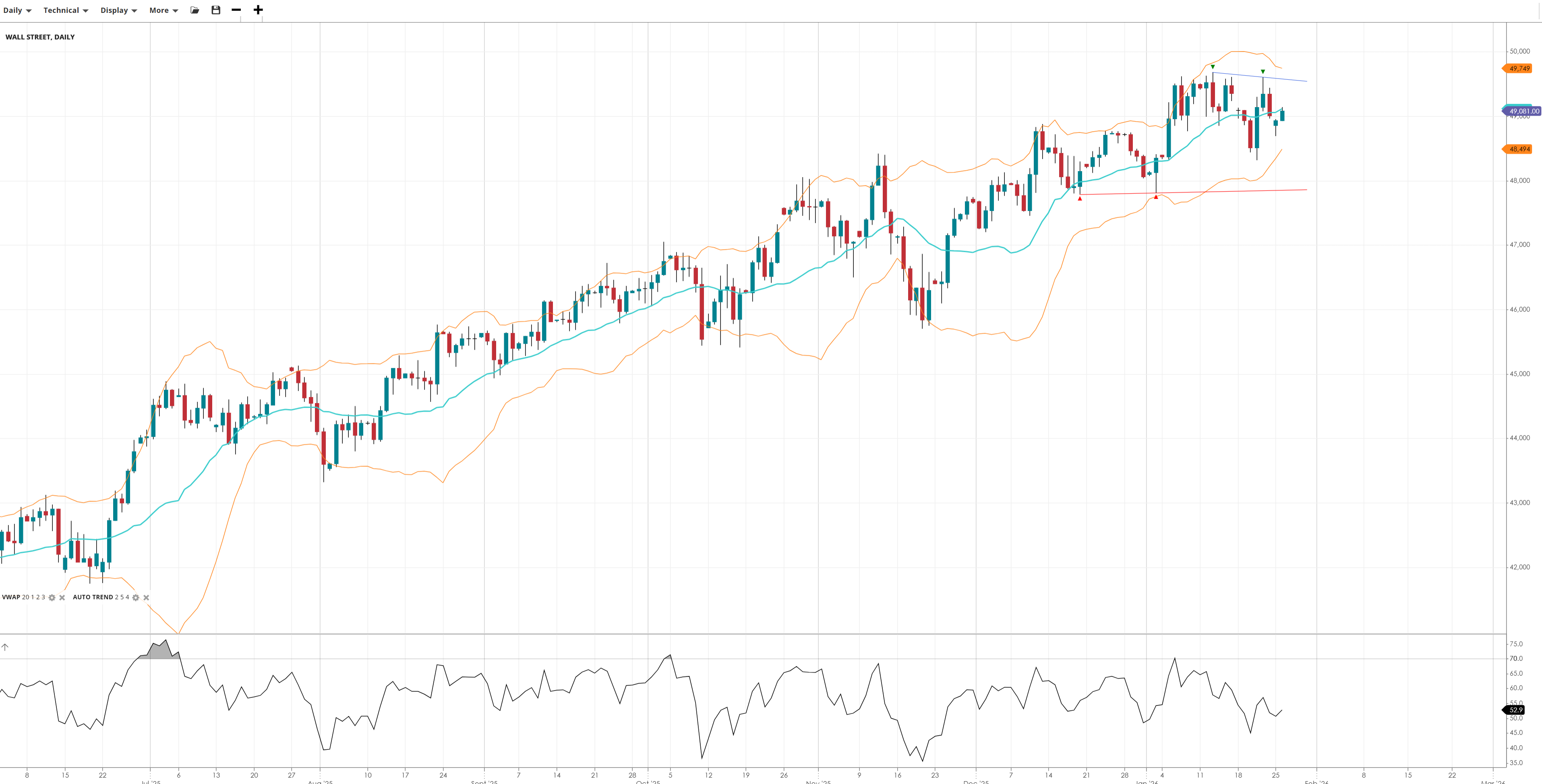 Wall Street is undergoing a sideways correction within its broader bullish trend, with price trading marginally below the VWAP. The market appears balanced, with neither side taking full control. Continued consolidation is possible unless price reclaims the VWAP with conviction.