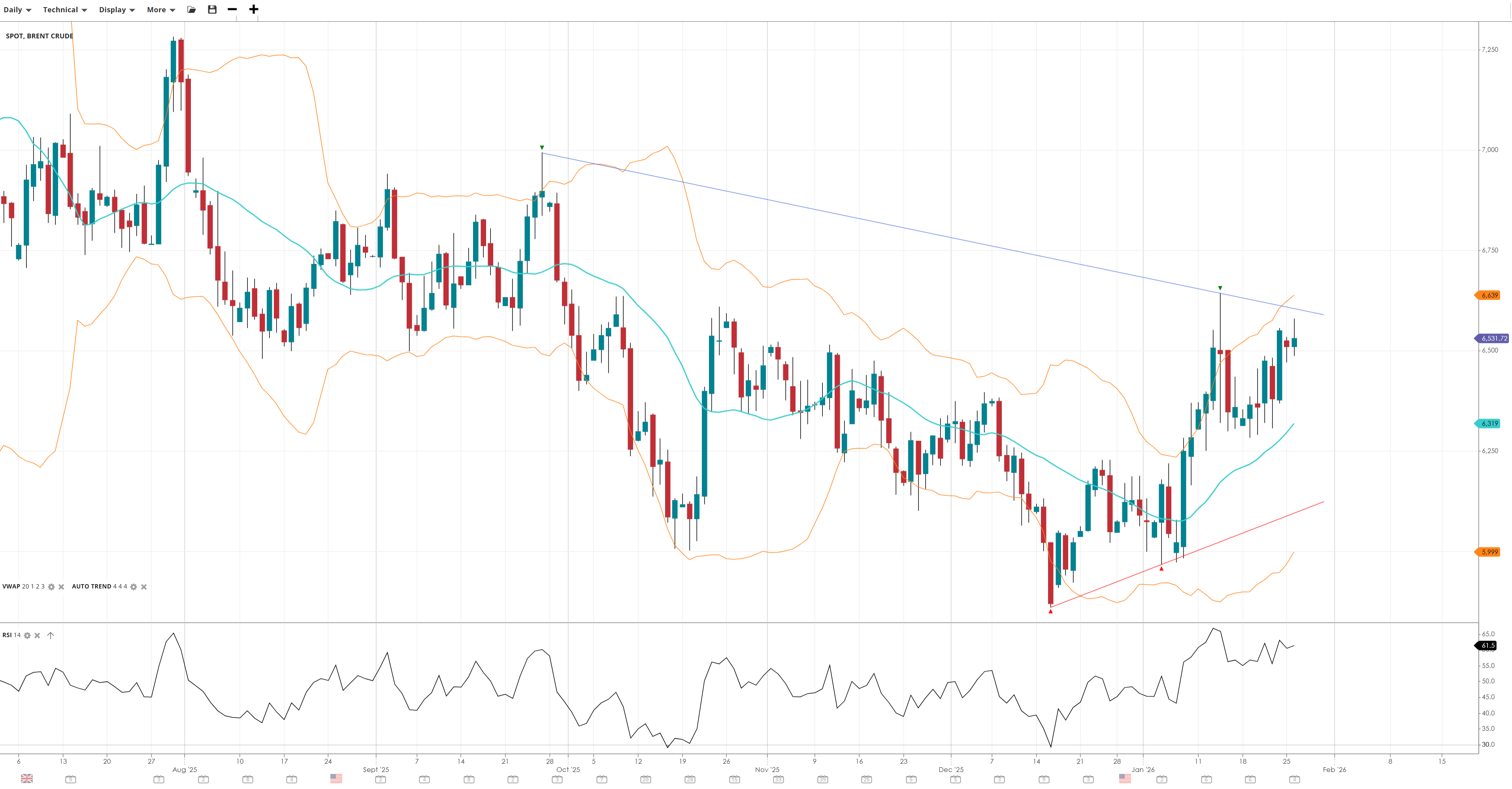 Brent Crude is attempting a bullish reversal after a long meandering downtrend and attempting to shift higher out of its recent consolidation, now positioned above the VWAP. Momentum is bullish and stable, and the market is testing resistance aligned with longer-term trend lines. Support near 60.0 remains firm.
