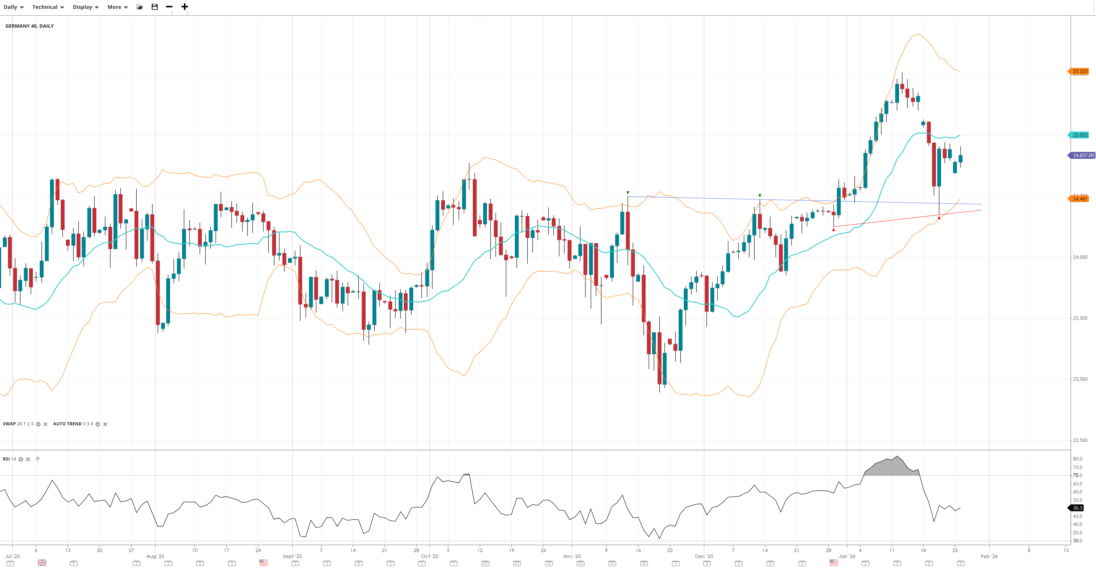 Germany 40 remains in a bullish trend but is attempting a rebound from a steep correction, with price action below the VWAP. Momentum has dropped off with RSI back under the 50 level, indicating a pause in the uptrend, with support still intact and resistance yet to be tested.