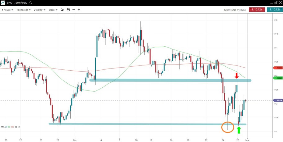 Price double-bottomed above 1.11 but faces stiff resistance near 1.13.