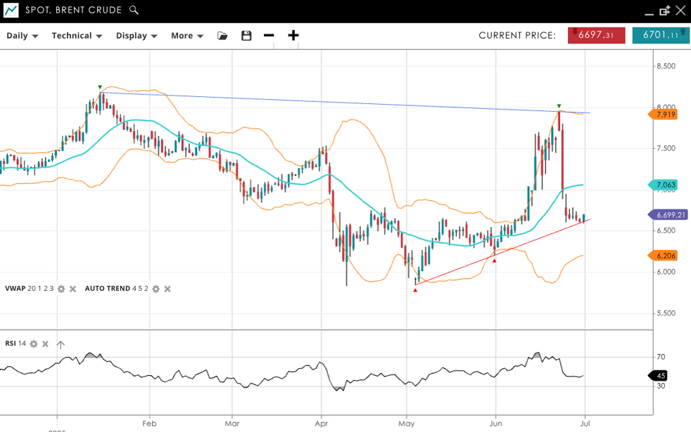 Brent Crude is currently in a neutral range phase, trading at 6,699 having slumped back below its VWAP of 7,063. The RSI at 45 signals low momentum. Support is noted at 6,206, with resistance at 7,919.