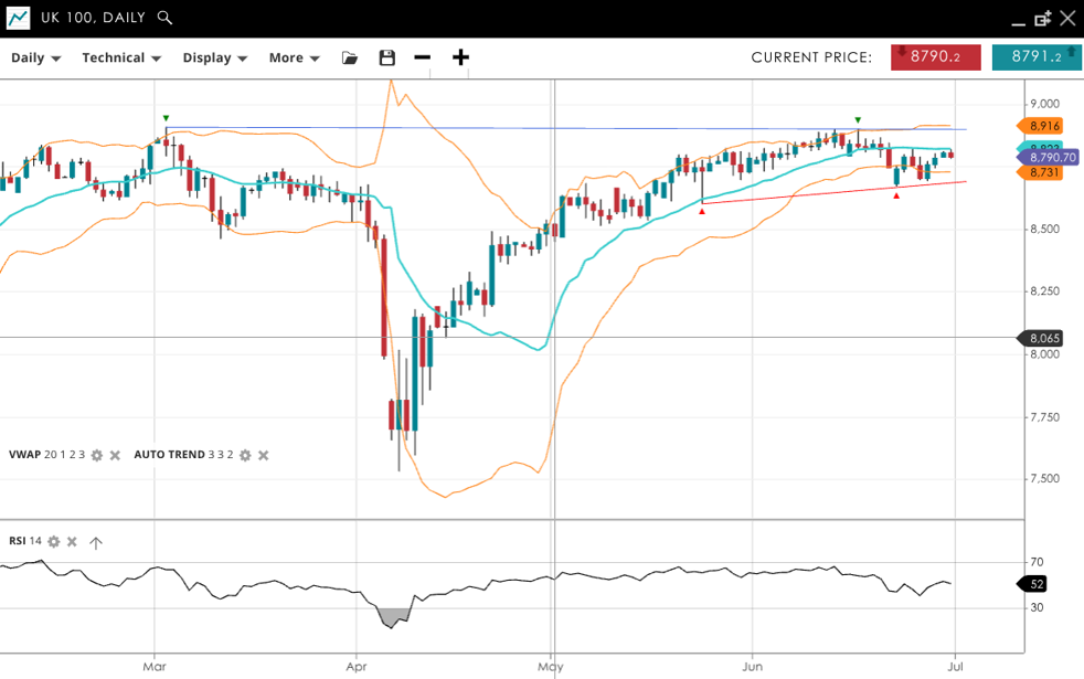 The UK 100 is also in a neutral range phase, trading at 8,791 just under the VWAP of 8,833 - still with 9k on the horizon. RSI sits at 52, indicating balance. Key support lies at 8,731, with resistance at 8,916.