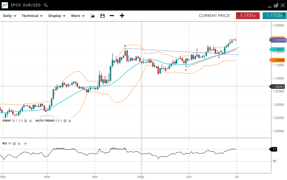 EUR/USD is bullish and breaking out - with the 1.20 handle in sight. It trades at 1.1722, easily above the VWAP of 1.1552. RSI at 71 reflects strong buying pressure. Support is at 1.1349, resistance at 1.1730.