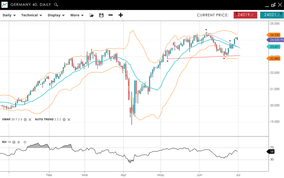 Germany 40 is neutral and ranging, eyeing a possible breakout. It trades at 24,021, close to its VWAP of 23,601. The RSI at 58 shows mild bullish bias. Support is at 22,882 and resistance at 24,320.