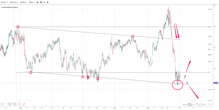Lloyds extended to 50.00 before a U-turn down to 40.80, where it met support. The 38.2% inverse Fibonacci of 42.00-47.50 at 40.00 is critical support. If lost, the 61.80% equivalent near 38.70 comes into focus. Otherwise, the channel bottom might hold, sending prices above 42.00 for a potential rally to the 43.30 and 44.00 Fibonaccis.
