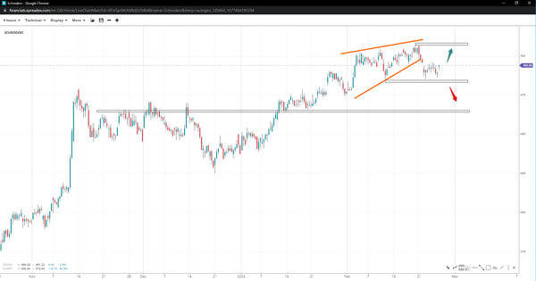 Schroders has formed a wedge pattern it might be due to deeper pullbacks to 465 if it losses 485, but it is unlikely to fall under 450. If bulls manage a solid bounce, the stock might break past the peak of 507 for an attempt at 525 next.