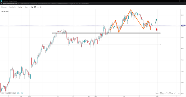 The UK 100 appears to have put in the right shoulder of a potential head-and-shoulders pattern at 7950. If 7850 fails to hold, it would confirm the pattern, and the index might see further losses to 7740. On the other hand, moving past the right shoulder might invalidate the H&S (or the right shoulder peak) after reclaiming the top.