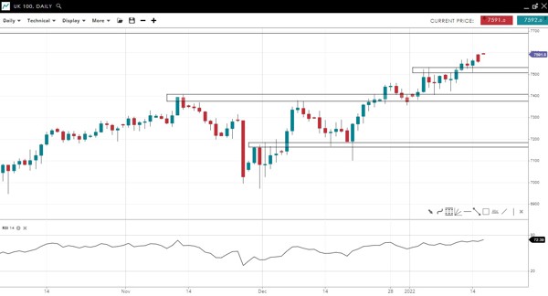 The UK 100 continues to probe highs not seen since before the pandemic. The former all-time high above 7700 is major resistance.