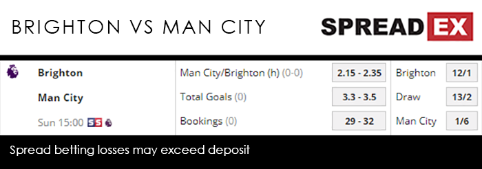 And though they haven’t exactly been at their best in the last couple of weeks, they most likely will demolish the Seagulls on Sunday, with Spreadex offering a Man City/Brighton (h) Goal Supremacy spread of 2.15-2.35, alongside a Total Goals spread of 3.3-3.5.