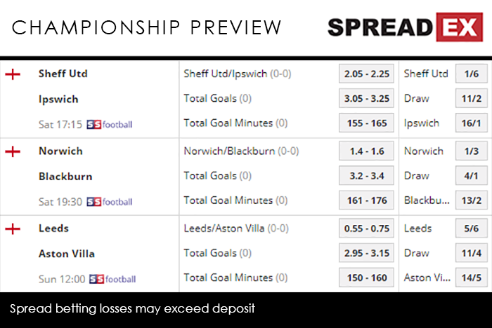Sheffield United are first up on Saturday, when they host Ipswich at 5.15pm on Sky Sports Football. The Blues are the worst side in the Championship, and are already relegated, meaning, on paper, Chris Wilder’s lot shouldn’t have too many issues, hence why Spreadex are offering a Sheffield United/Ipswich Goal Supremacy spread of 2.05-2.25, alongside a Total Goals spread of 3.05-3.25. With United holding a blade to their throat, Norwich then take on Blackburn at 7.30pm on Sky Sports Football. The Rovers appeared to be firmly out the other side of their terrible run across February and March, picking up 4 consecutive wins over Derby, Nottingham Forest, QPR and Bolton. The Canaries, meanwhile, might not have lost in their last 12 games, but they’ve now drawn 4 times on the trot, meaning Saturday’s result isn’t necessarily as clear cut as it might seem. Nevertheless, Spreadex are offering a Norwich/Blackburn Goal Supremacy spread of 1.4-1.6, alongside a Total Goals spread of 3.2-3.4. Finally, Sunday sees Leeds face Aston Villa at 12pm on Sky Sports Football. An inconsistent showing in 2019, including losses to Wigan and Brentford in their last 2 games, means the Whites need a healthy dose of good fortune if they are to avoid the play-offs. Villa, meanwhile, will merely want to strengthen their standing ahead of their guaranteed trip to Wembley. The hosts are still favourites, despite their recent dip in form, with Spreadex offering a Leeds/Aston Villa Goal Supremacy spread of 0.55-0.75, alongside a Total Goals spread of 2.95-3.15.