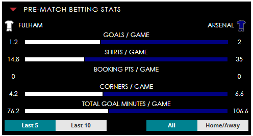 To see all the Fulham v Arsenal betting stats and form, visit our pricing page to view our Pre-Match betting stats table or hover over/tap the chart image to see previous outcomes for that particular market.