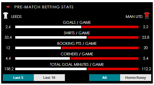 To see all the Leeds v Man Utd betting stats and form, visit our pricing page to view our Pre-Match betting stats table or hover over/tap the chart image to see previous outcomes for that particular market.