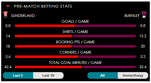 To see all the Sunderland v Burnley betting stats and form, visit our pricing page to view our Pre-Match betting stats table or hover over/tap the chart image to see previous outcomes for that particular market.
